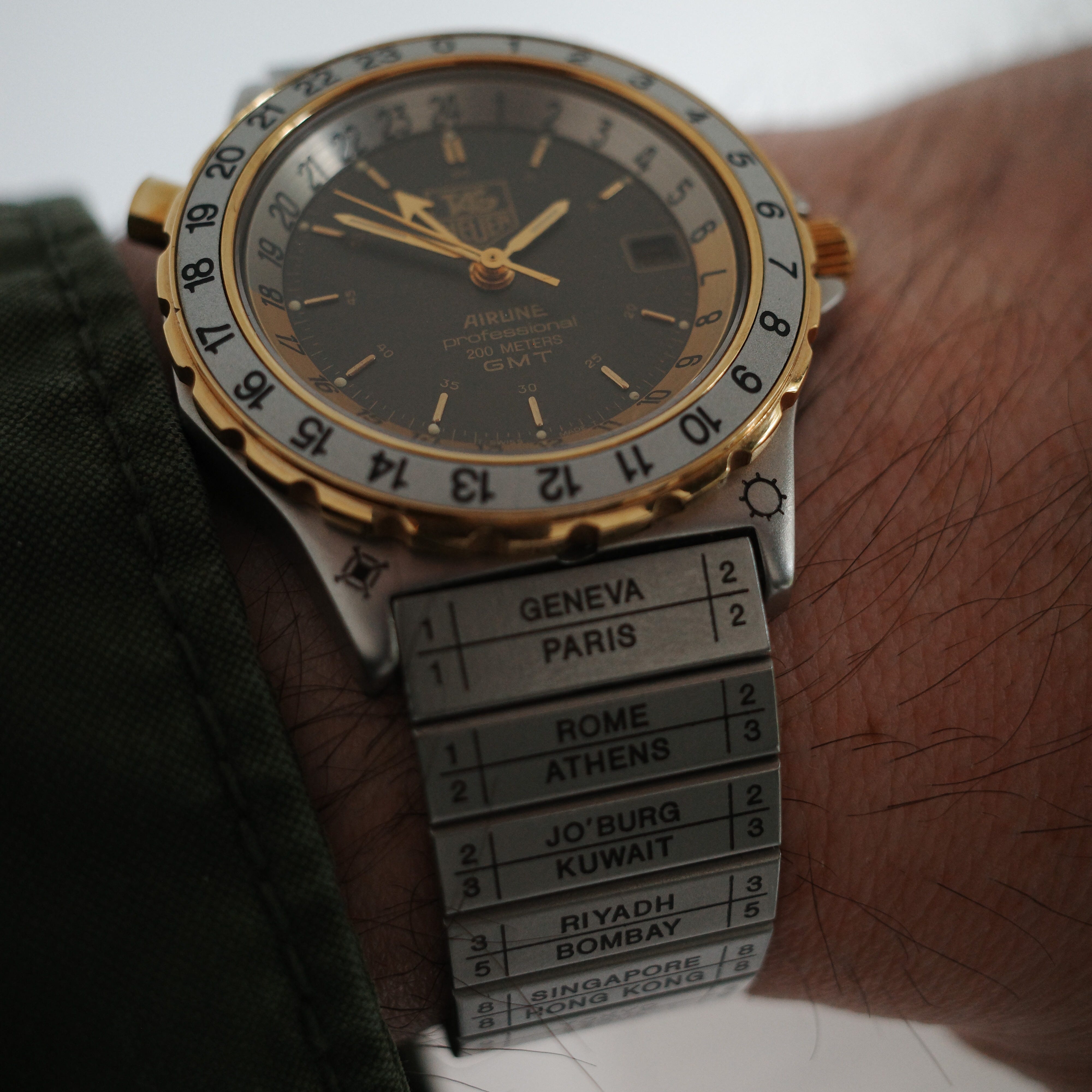 The Airline 24 H GMT is impossible to miss. Its bracelet features city names printed on the links like they’re passport stamps.