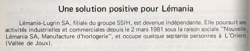 Lémania-Lugrin SA, a subsidiary of the SSIH group, has become independent. It has continued its industrial and commercial activities since March 2, 1981, under the corporate name “Nouvelle Lémania SA, Manufacture d’Horlogerie”, and employs around seventy people in L’Orient (Vallée de Joux).”