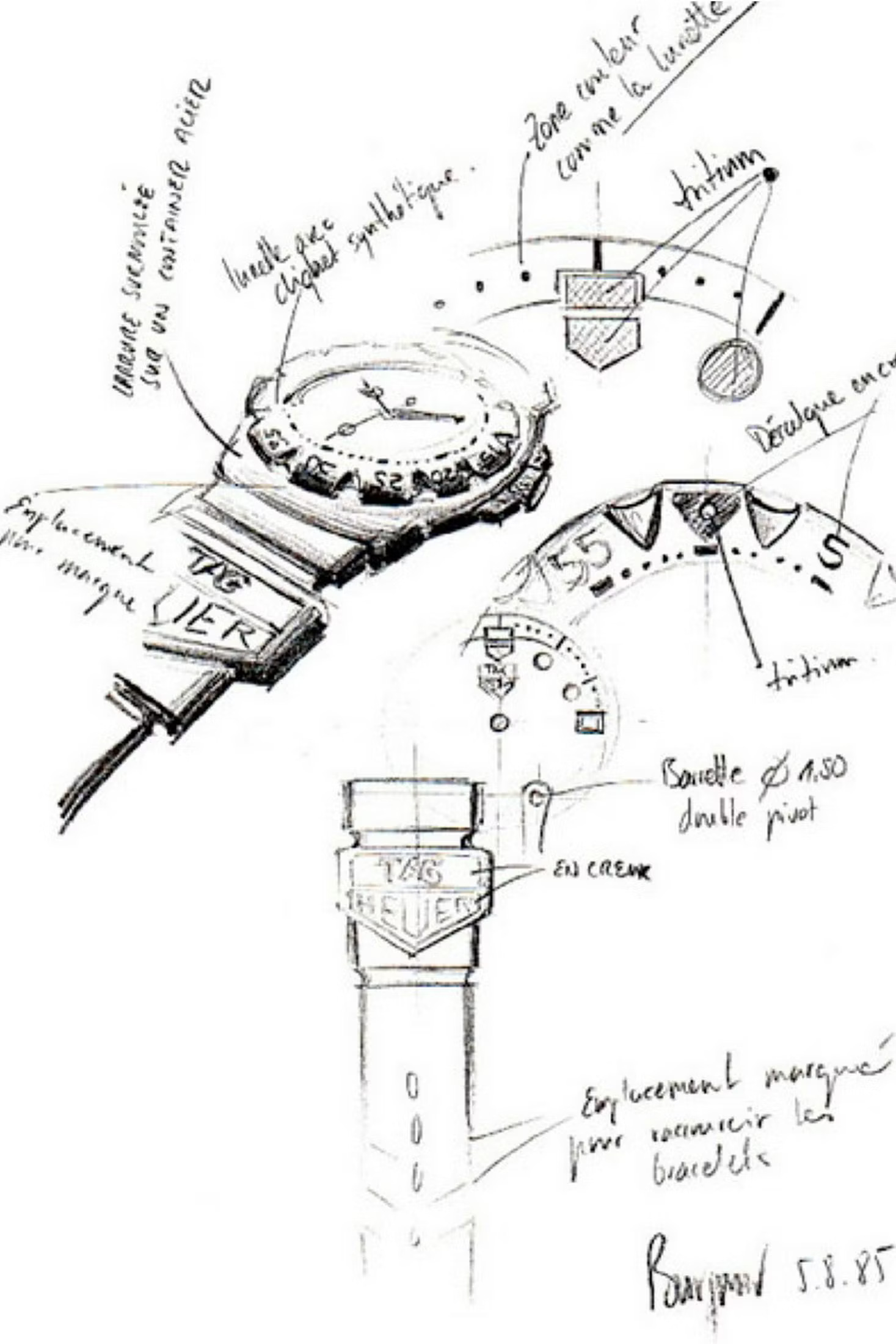 He also shares a sketch of the Formula 1, branded TAG Heuer, helpfully dated August 5, 1985.