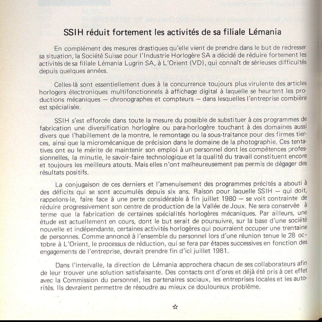 The combination of these factors and the reduction of the aforementioned programs has led to deficits that have accumulated over the past six years. For this reason, SSIH – which, it should be recalled, had to face a considerable loss at the end of July 1980 – is now forced to progressively reduce its production center in the Vallée de Joux. In the long term, only the manufacture of certain mechanical watchmaking specialties will be retained. Moreover, a study is currently underway with the aim of continuing, on the basis of a new and independent company, certain watchmaking activities that could employ around thirty people. As announced to all staff during a meeting held on October 28 in L’Orient, the reduction process, which will take place in successive stages depending on the company’s commitments, should be completed by July 1981.”