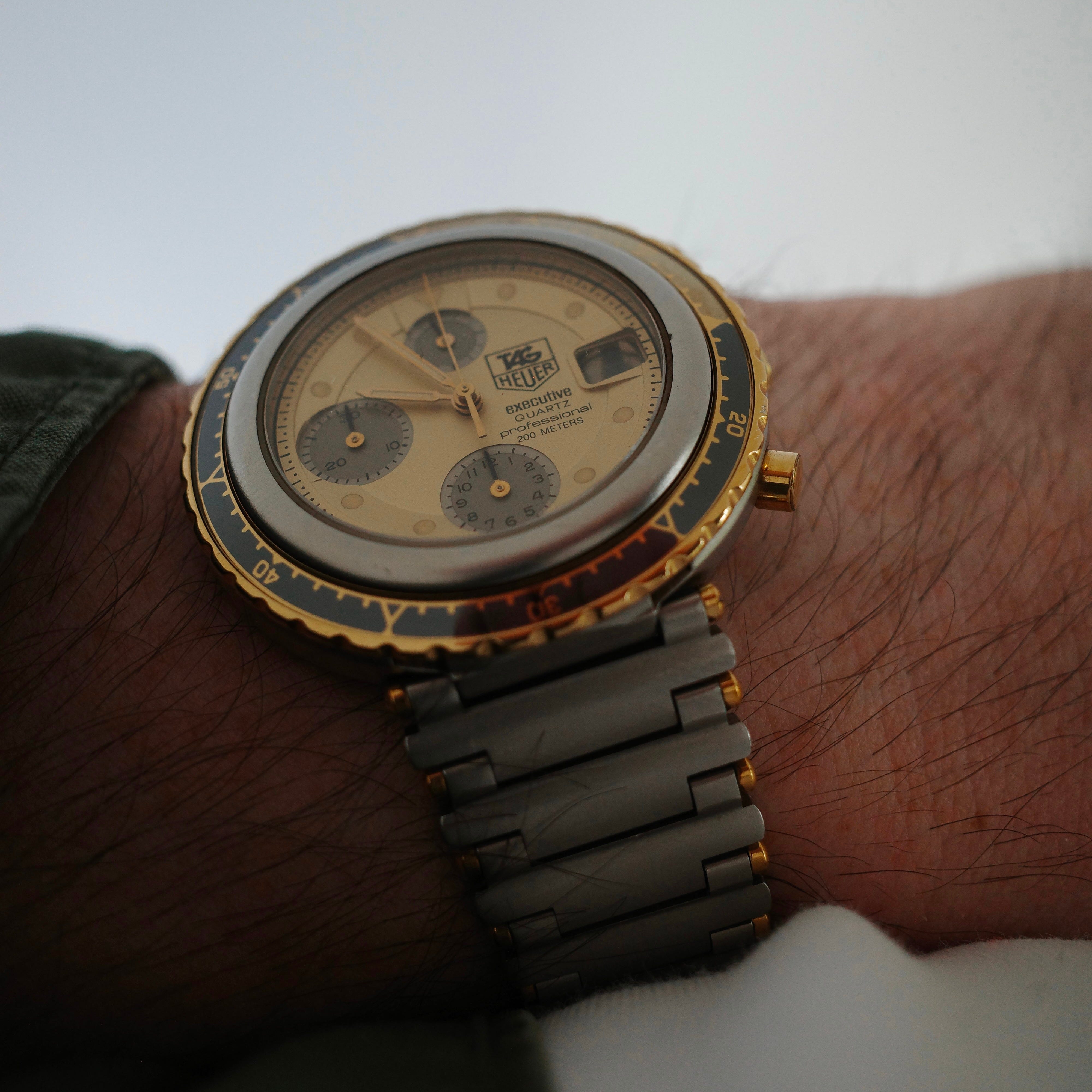 He also designed the Executive, an attempt to make a “flatter” dive watch with a more elegant look. The Executive line features a rotating, partially-lumed bezel that fits around the case rather than on the front of it. The quartz Executive was 2x the price of Heuer’s Lemania-powered chronographs at launch.