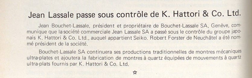 Jean Bouchet-Lassale, chairman and owner of Bouchet-Lassale SA, Geneva, announces that the commercial company Jean Lassale SA has come under the control of the Japanese group K. Hattori & Co. Ltd., to which Seiko belongs. Robert Forster of Neuchâtel has been appointed chairman of the company.